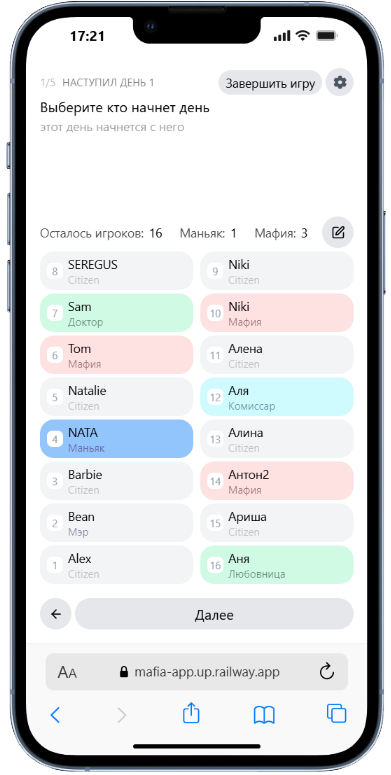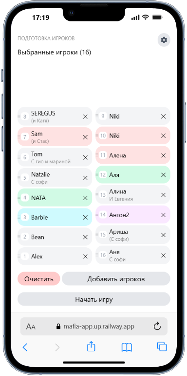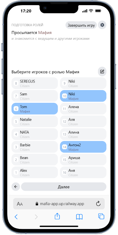 Список игроков реализован в 2 столбца с порядком по кругу с нижнего левого угла, что имитирует посадку игроков за круглым столом и позволяет ведущему проще ориентироваться по списку.
