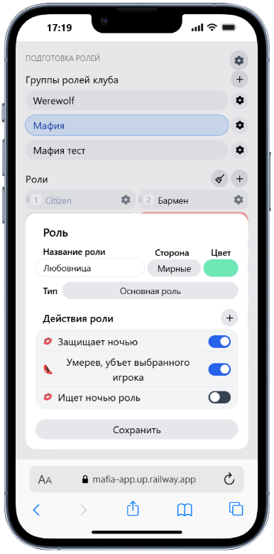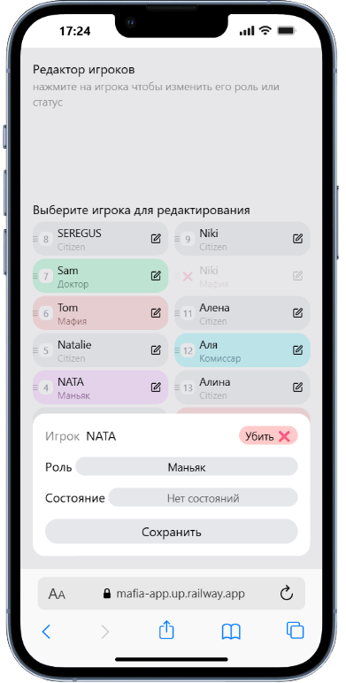 Перед началом каждой игры, Вы можете указать какие роли будут в этой игре.