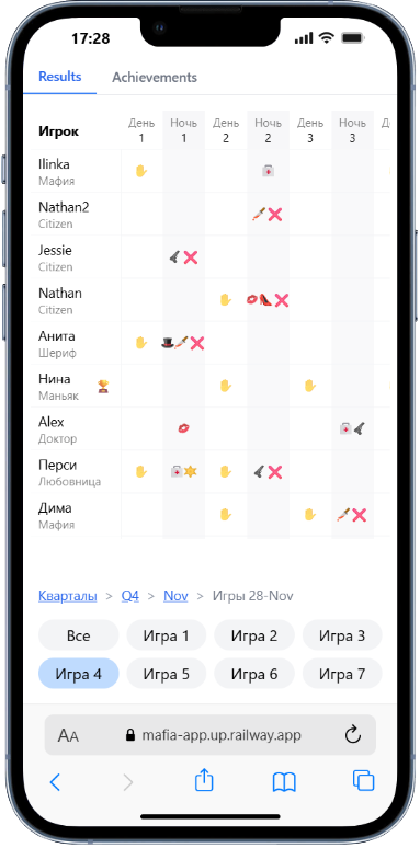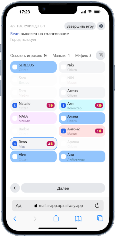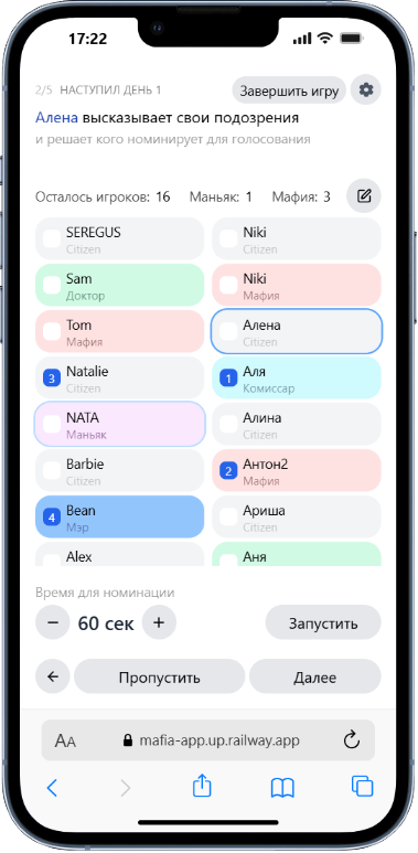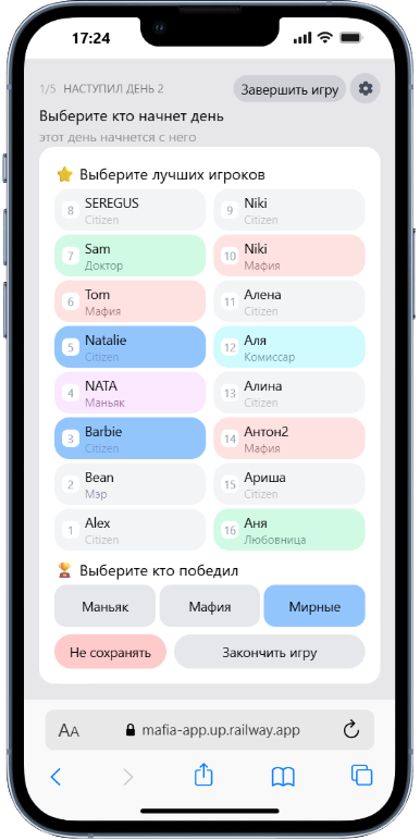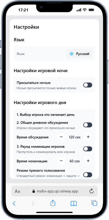 «Дневной» этап игры можно настроить под правила Вашего клуба — разные режимы номинации и голосования, таймеры не каждый этап, общее время на обсуждение событий.