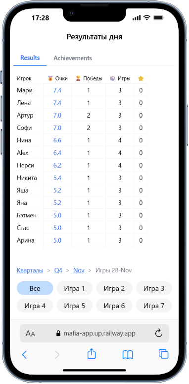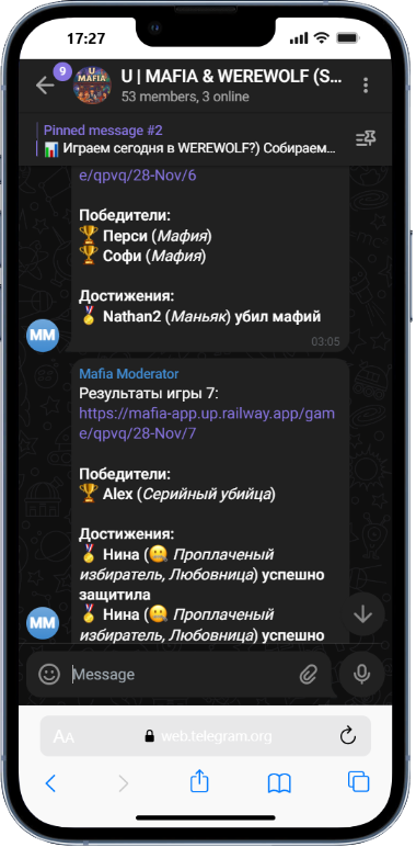 После завершения игры телеграм-бот присылает результаты игры и все игроки могут посмотреть лог игры и все события.