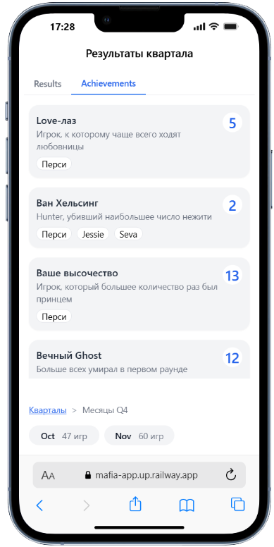 Все игры сохраняются на сервере. Игроки могут посмотреть лог каждой игры в отдельности — всю информацию о том, кто кого убивал/лечил и т.д.