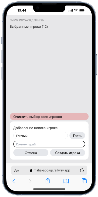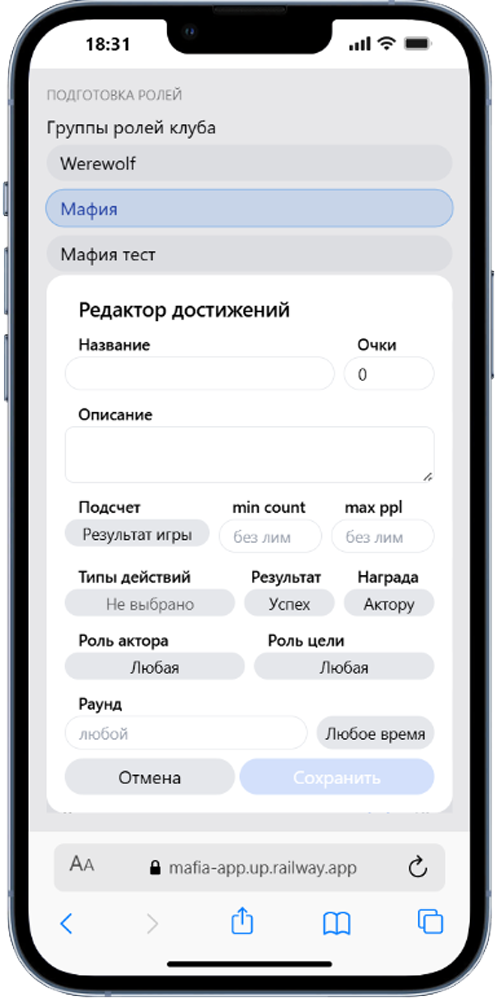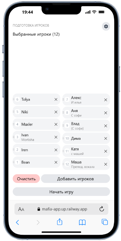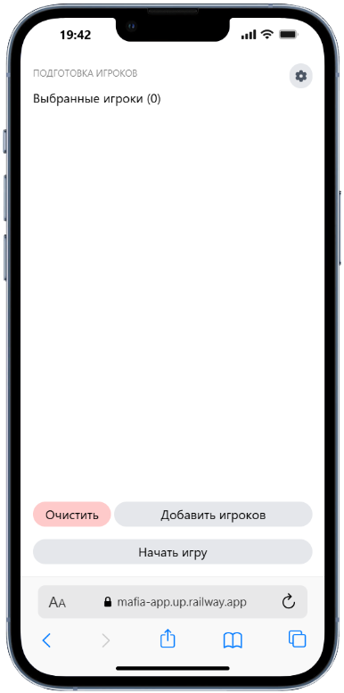 Перейдите обратно в браузер и по той же ссылке (https://mafia-app.up.railway.app/) Вы попадете на начальный экран приложения, после чего Вы можете начать настраивать его под свой Клуб.