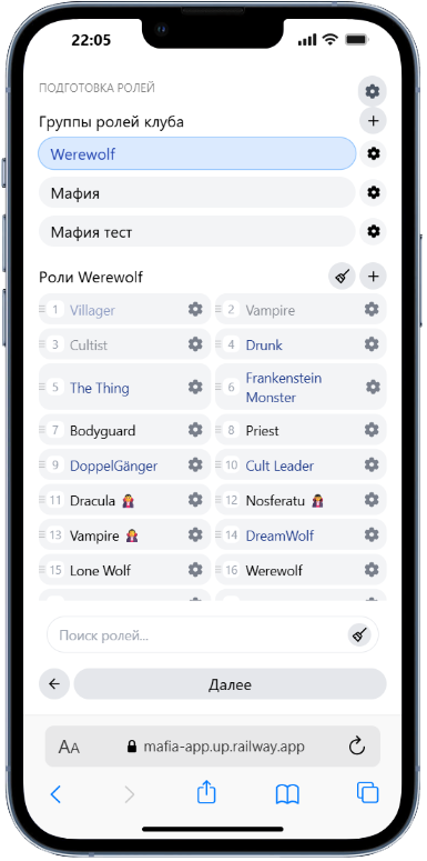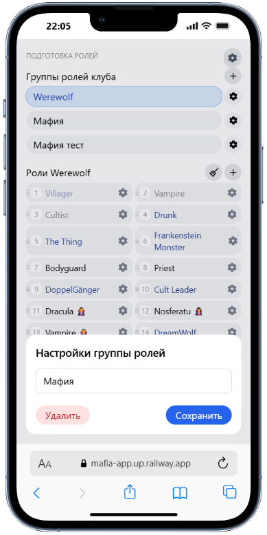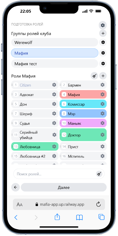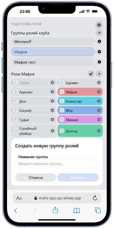 Если Вы проводите несколько разных по механикам игр, например Спортивную Мафию, Городскую Мафию, Мафию для детей и т.п., Вы можете создать несколько групп ролей под каждый тип игры.