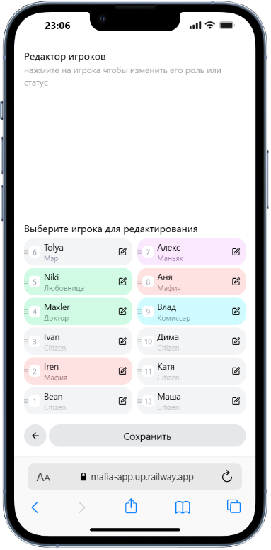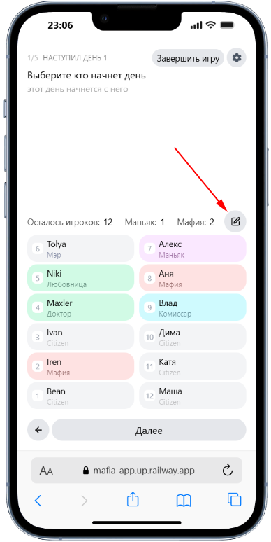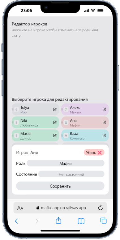 В любой момент игры вы можете изменить порядок посадки игроков за «столом», убить игрока или воскресить его при необходимости, поменять его роль или изменить его дополнительные состояния.